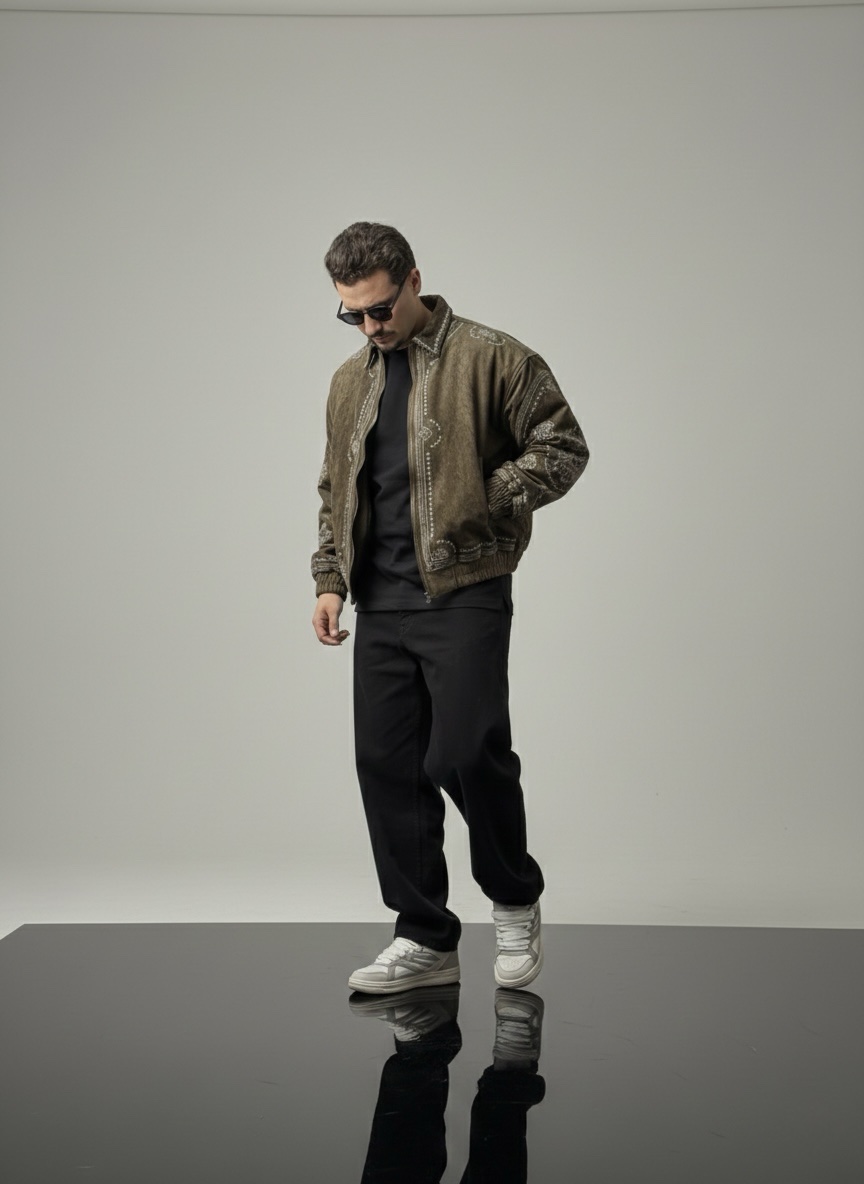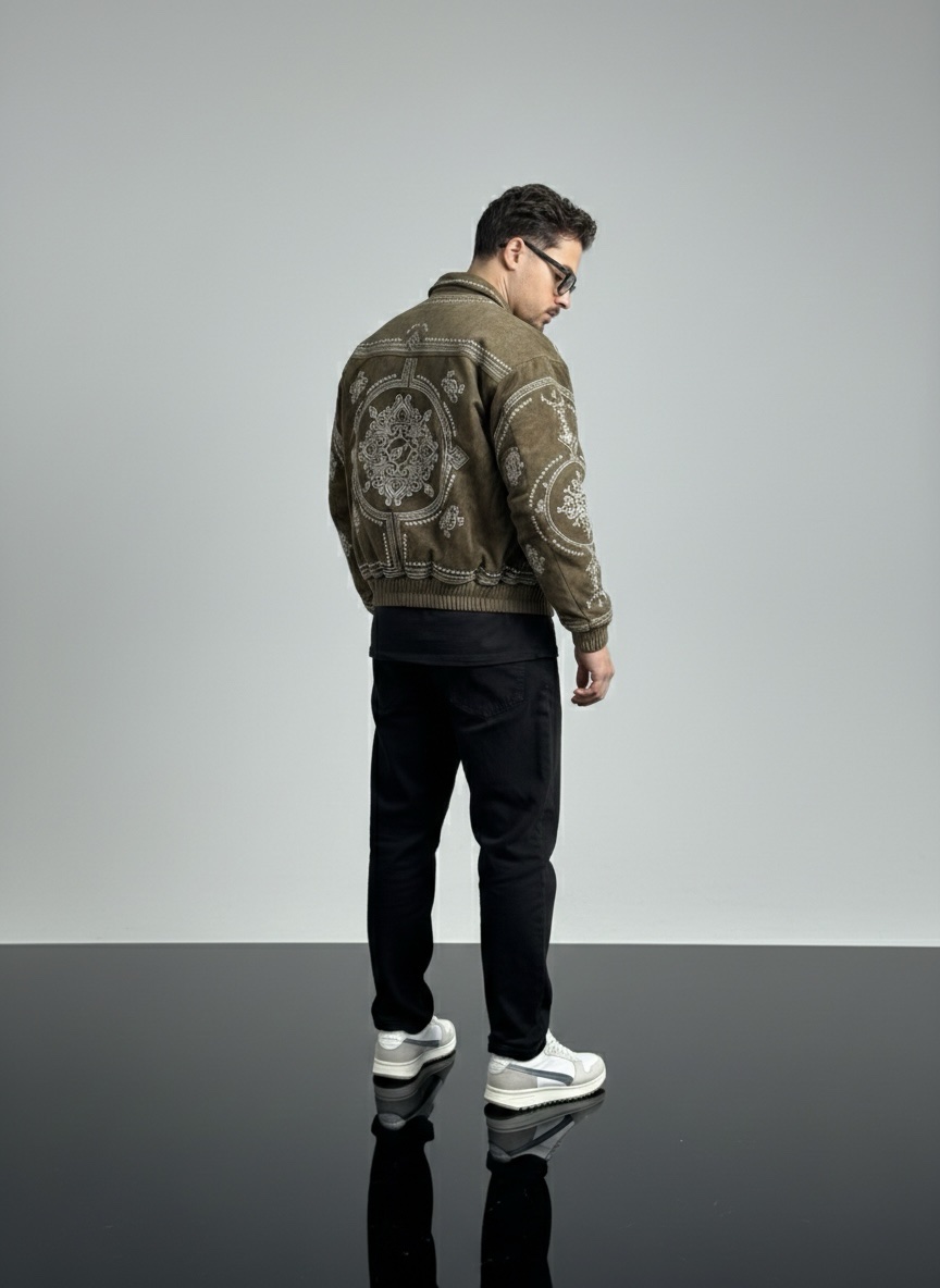 Veste Artisanale Brodée – Noir / Vert Militaire